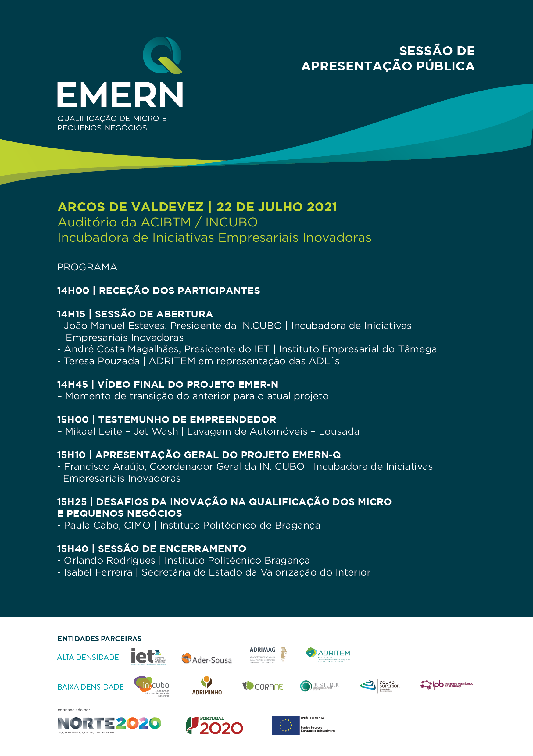 A Sessão Pública de Apresentação do Projeto EMERN-Q Qualificação de Micro e Pequenos Negócios realiza-se no próximo dia 22 Julho às 14h00, com transmissão em live streaming na página de facebook @portugalemern