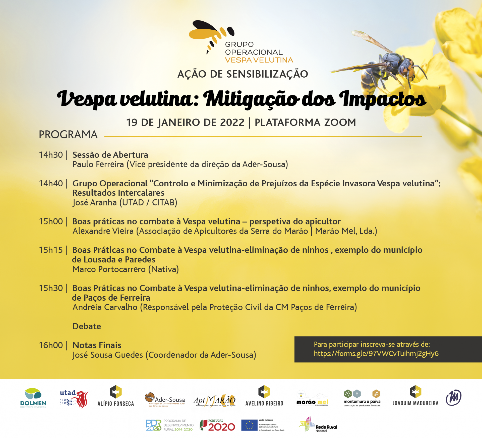 A Ader-Sousa realiza no próximo dia 19 de abril de 2022 (plataforma Zoom) uma Ação de Sensibilização “Vespa Velutina: mitigação dos impactos”, no âmbito do Grupo Operacional – Controlo e Minimização de Prejuízos da Espécie Invasora Vespa Velutina nigrithorax na Produção Apícola, cofinanciado pelo PDR 2020, assumindo-se como principal objetivo desta iniciativa, a partilha do conhecimento gerado.