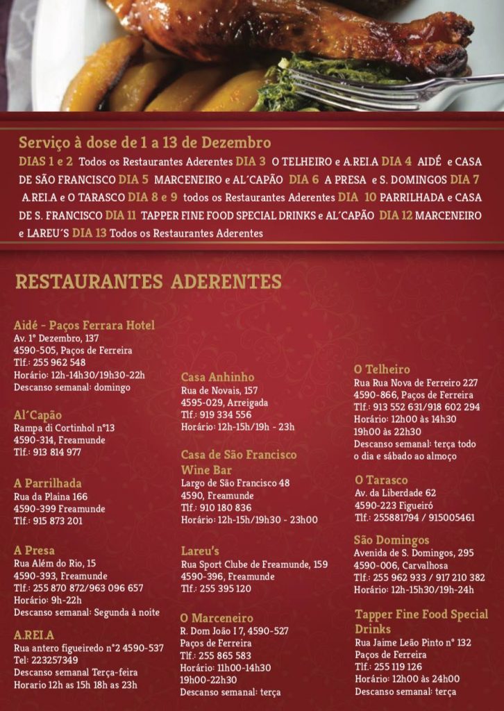 Entre 30 de novembro e 13 de dezembro, 14 restaurantes de Paços de Ferreira recebem a XIV Semana Gastronómica do Capão à Freamunde. Faça já a sua marcação num dos restaurantes aderentes: